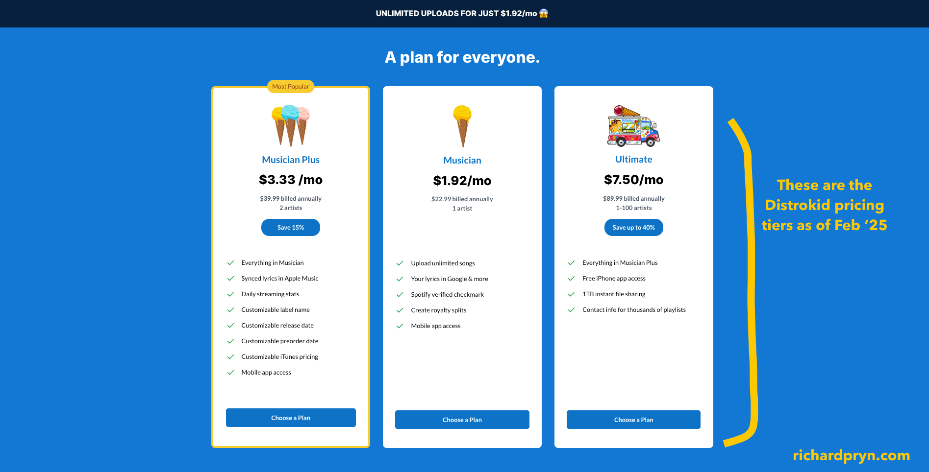 Distrokid's pricing and plans appear very reasonable. They seem to be the most competitive for pricing...but...