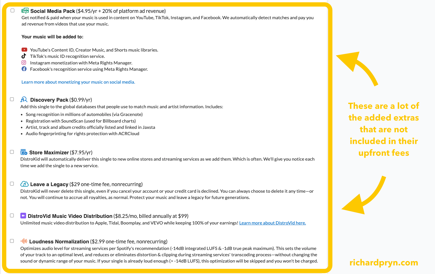 Here you can see some of the optional paid-for extras Distrokid offers. So if you add these up then the attractive low fees suddenly level out to be not that much less than their competitors.