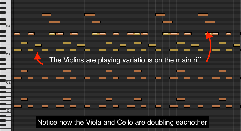 From here it is a simple case of just letting the pulse double up and to elongate the main riff. This topped with layering the cello and the 1st Violin playing a variation on the riff gives the piece a really full sound.