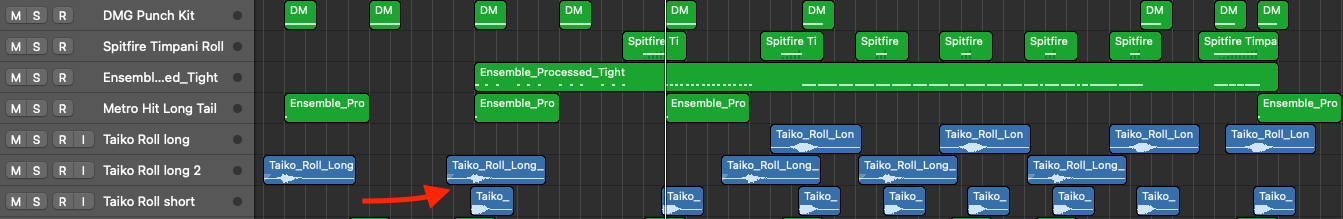In this case, I used a mixture of Taiko rolls from 8Dio’s Hybrid Tools, Sub Booms from Heavyocity Damage, and Timpani Rolls from Spitfire Audio’s Percussion Library.