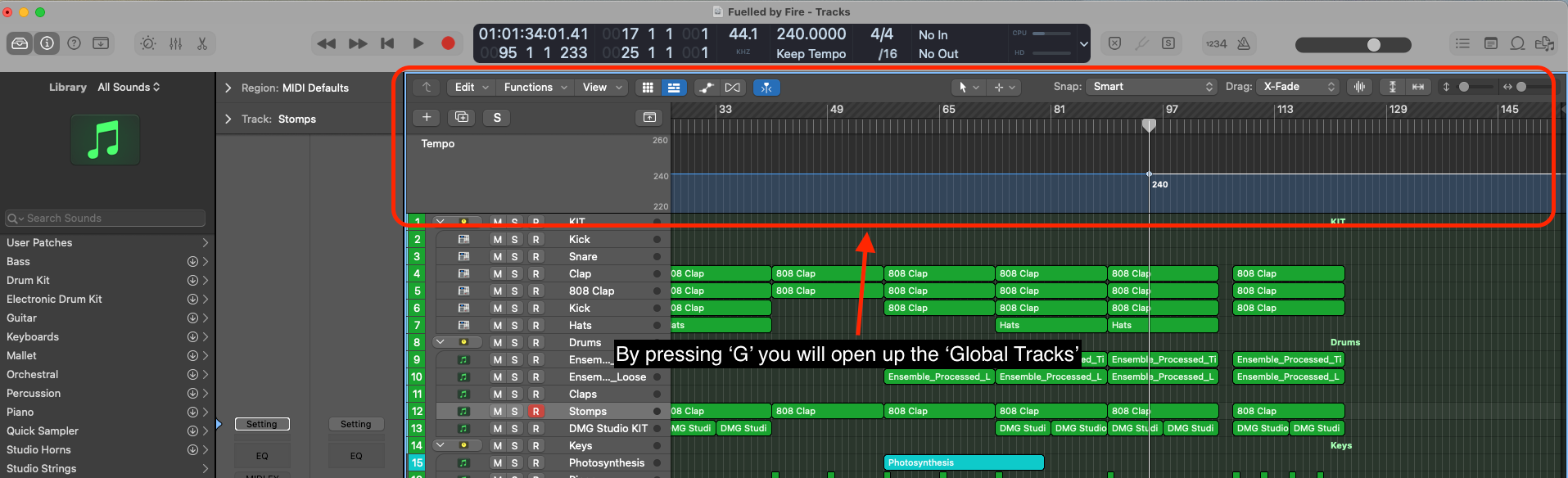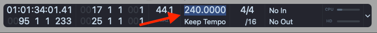 Above where it says "Keep Tempo" in the image you will see 240.0000 - this is the BPM or 'Beats per Minute' (tempo) of my track.