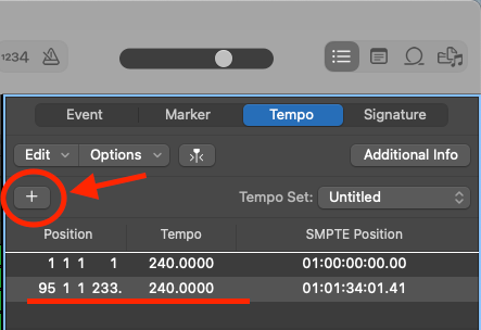 Don't worry if you have created it in the wrong position. You can either edit the position by double-clicking on it or you can move your playhead to the correct position and click '+'. Don't forget to delete the incorrect tempo.