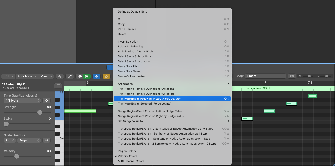 - In the menu that appears, select "Trim Notes to Following Notes (Force Legato)"