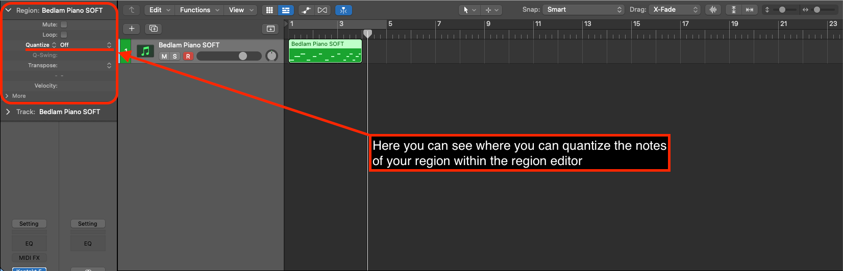 When you select the region you want to quantize the region editor will appear on the left-hand side (see below).
