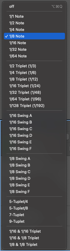 When you click on the dropdown menu (where it shows "1/8 Note" in the image above) you will be shown all the beat divisions that you can quantize to.