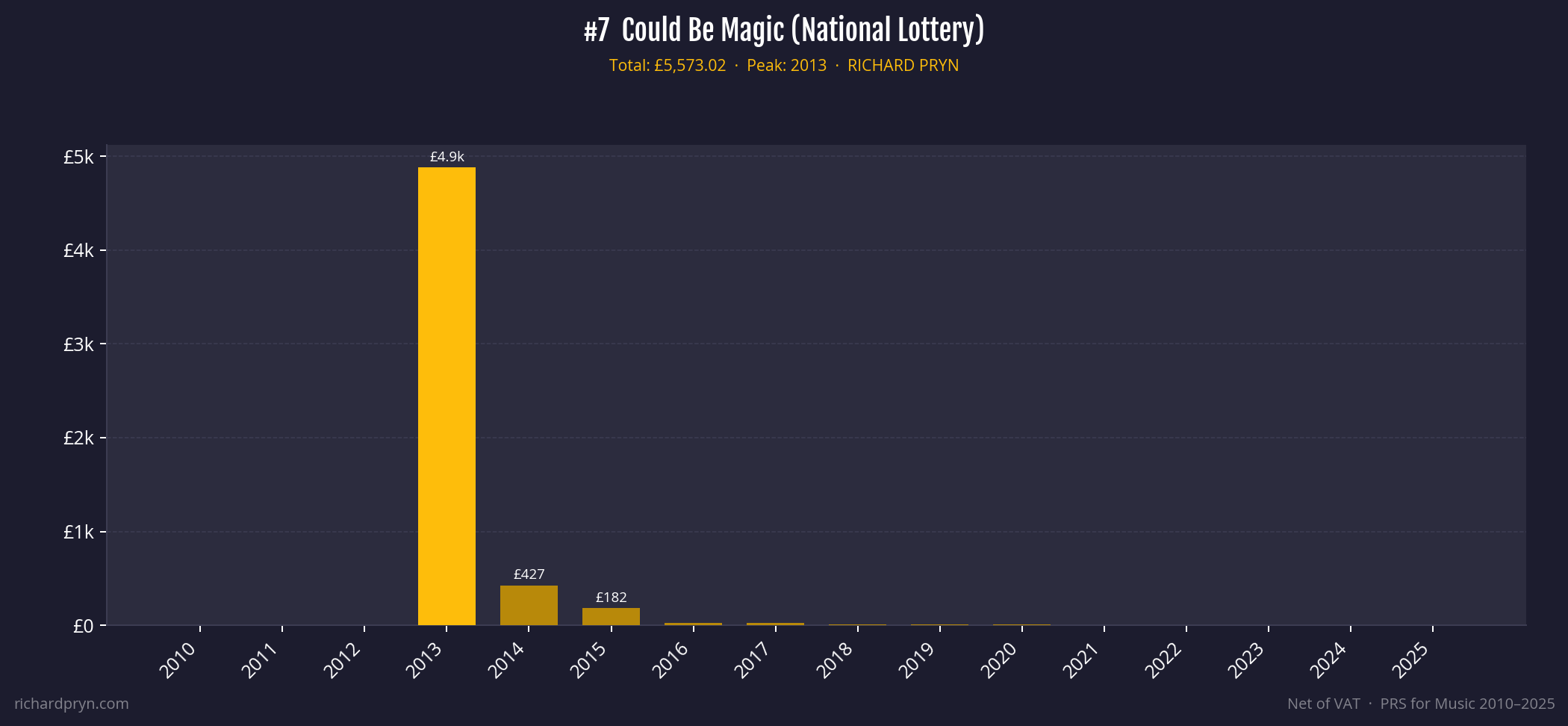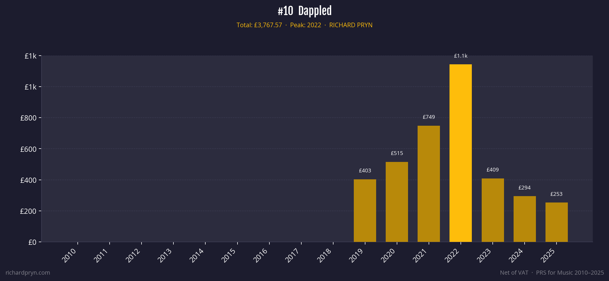 Dormant for two years, then a single French TV placement on TF1 generates ยฃ6,097 in 12 months. That's the whole "why you keep submitting" argument in one data point.