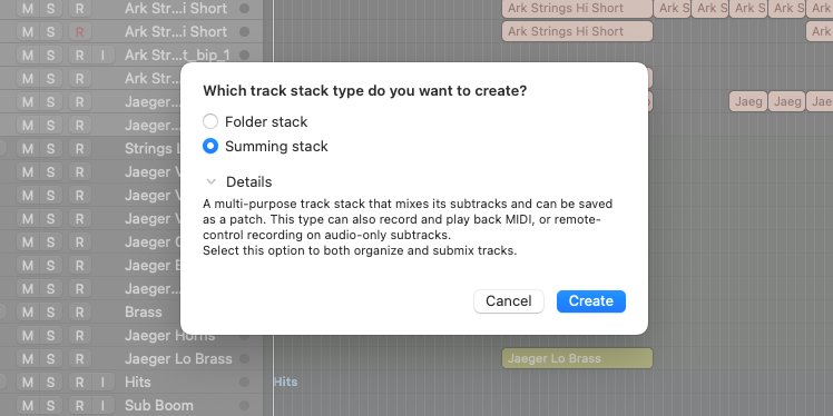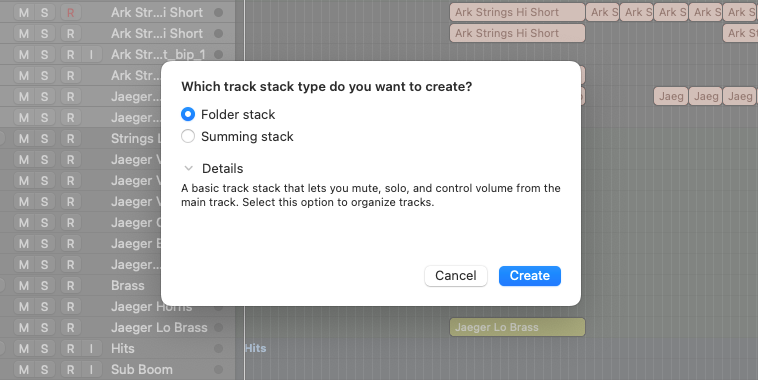 How to add tracks to a track stack in Logic