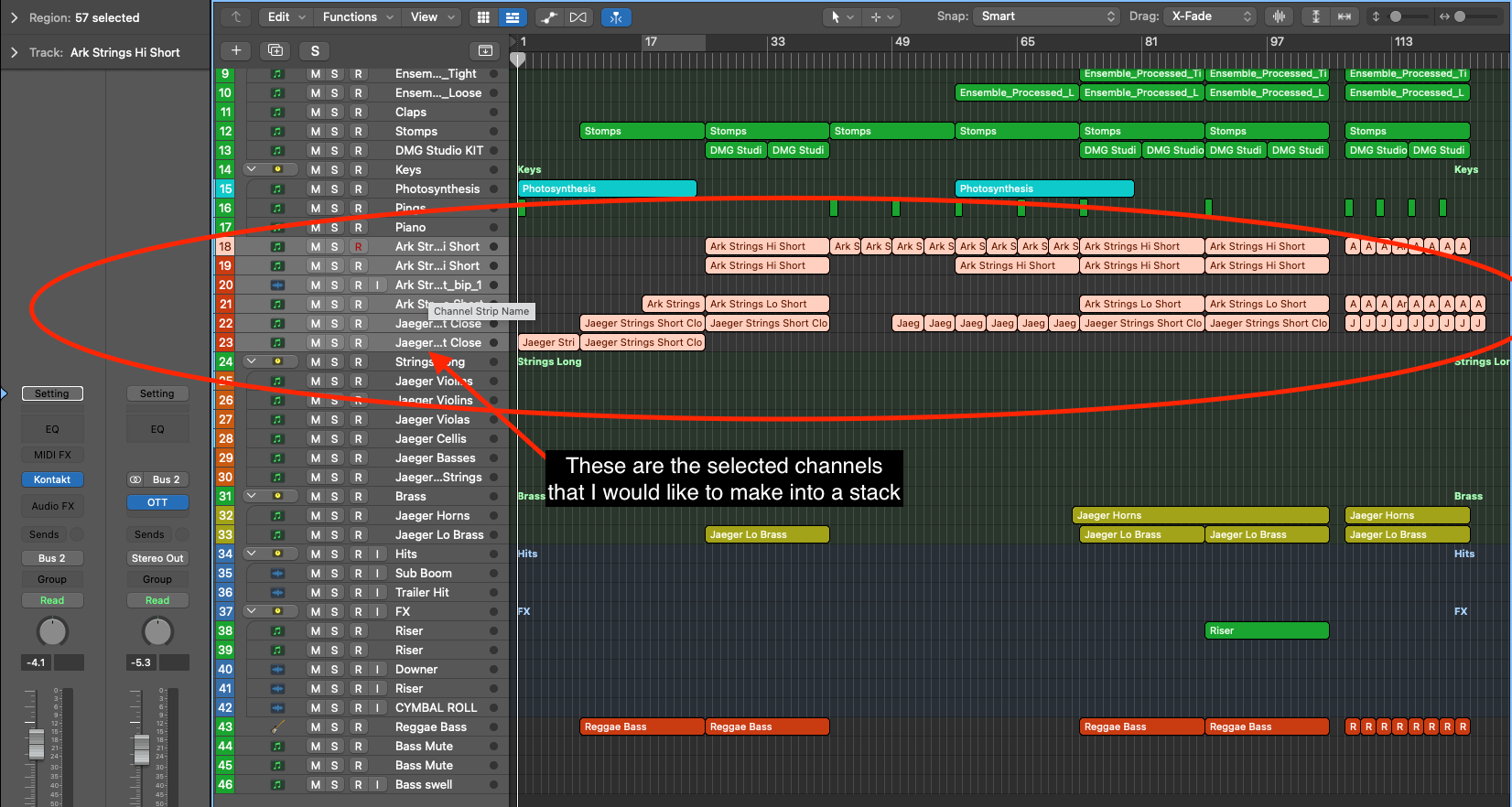 In the arrange window. Select the channels you want to group together. You can do this by selecting the first channel you want to be part of the folder stack, holding down the command key and clicking on all the tracks you want to be added. Or just click and dragging over the channels you want to group.